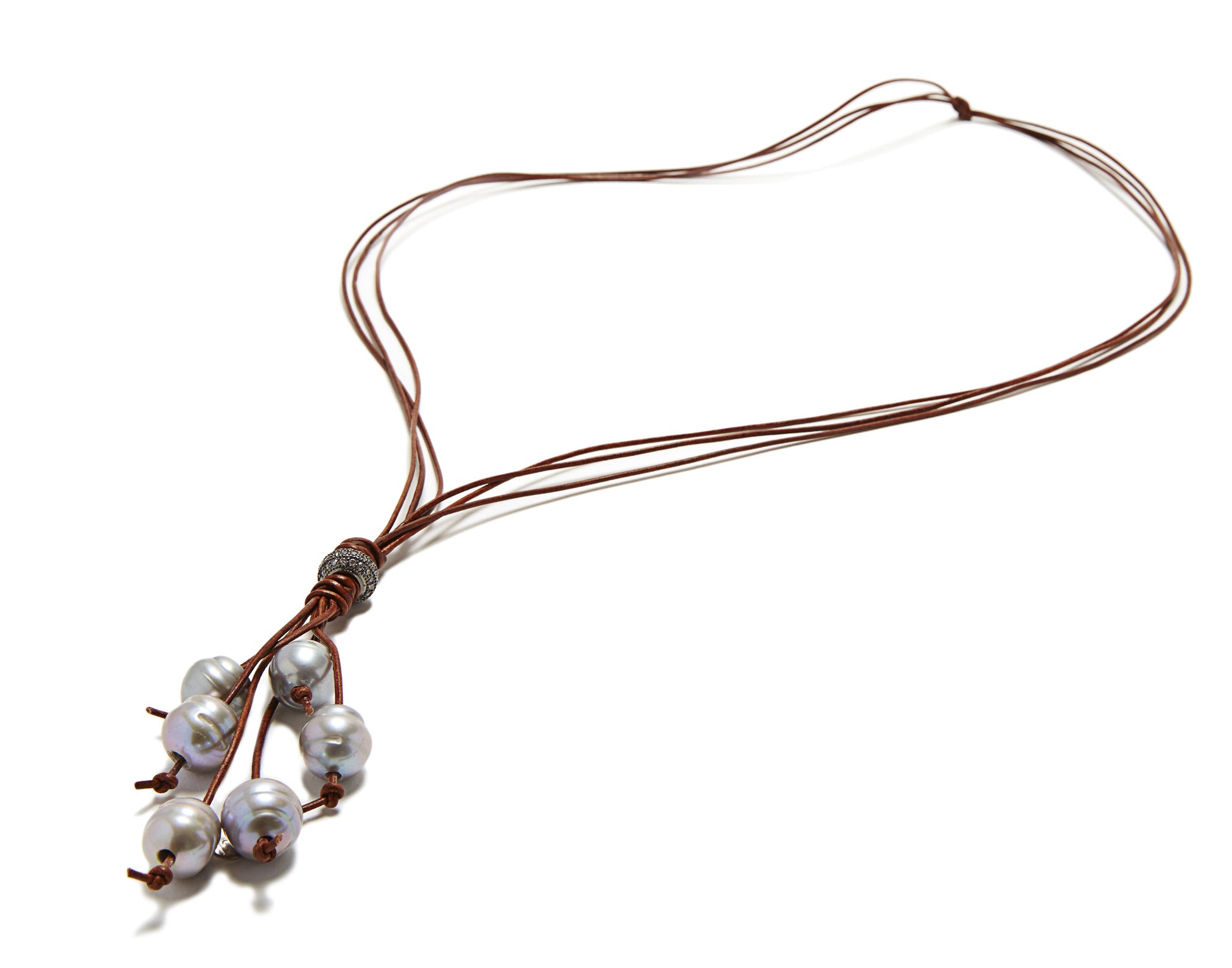 Beautiful long necklace in Greek leather with a stunning pearl cluster drop.