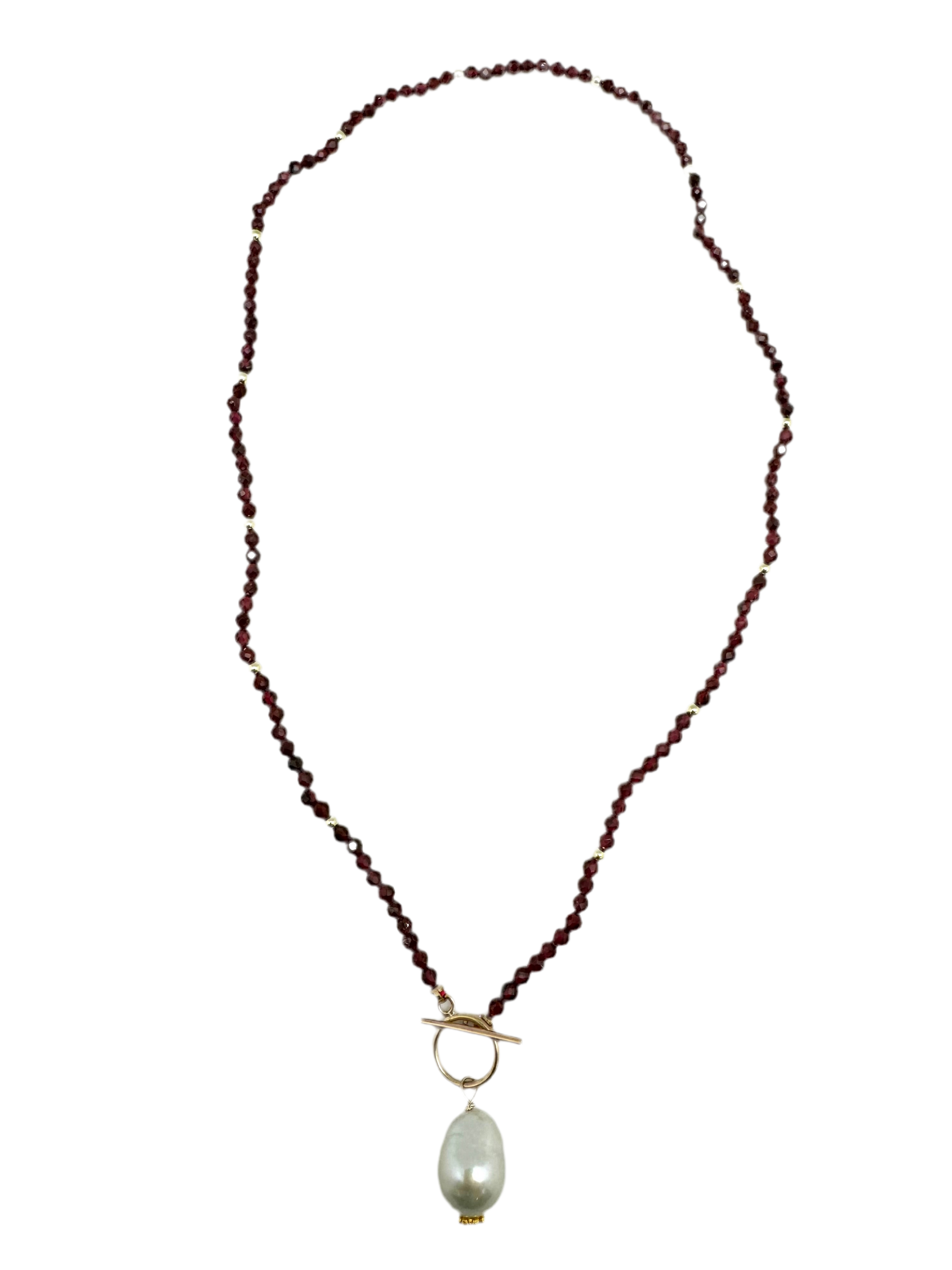 A sweet little necklace with garnet stones. Gold fill clasp and fresh water baroque pearl. 17” long