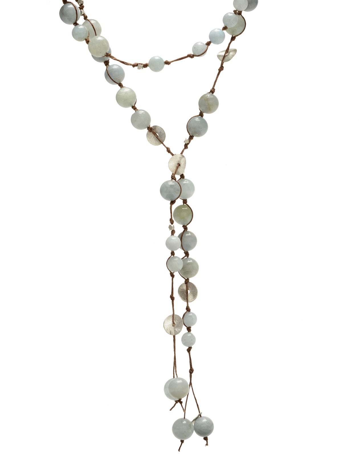 Beautiful long lariat with different sized round beads strung on Irish waxed linen with silver plated discs and nuggets.
