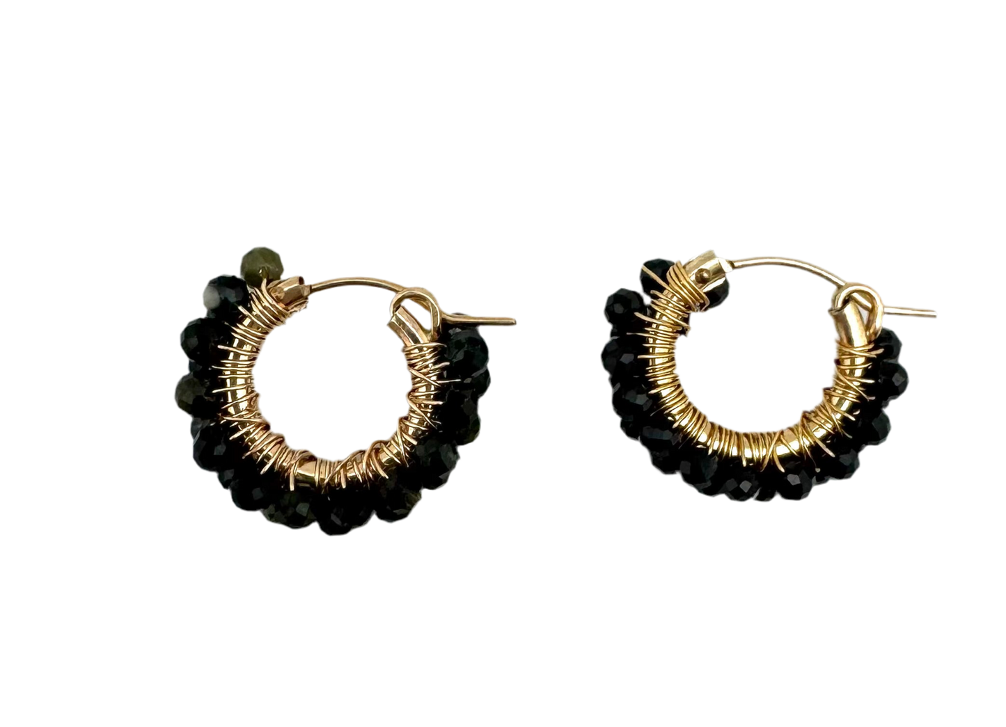 Feminine and fun hoop hand wrapped with black spinel beads. Gold fill 15mm hoop.