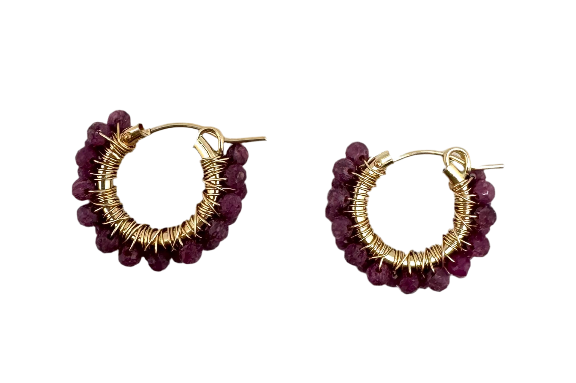 Feminine and fun hoop hand wrapped with ruby beads. Gold fill 15mm hoop.