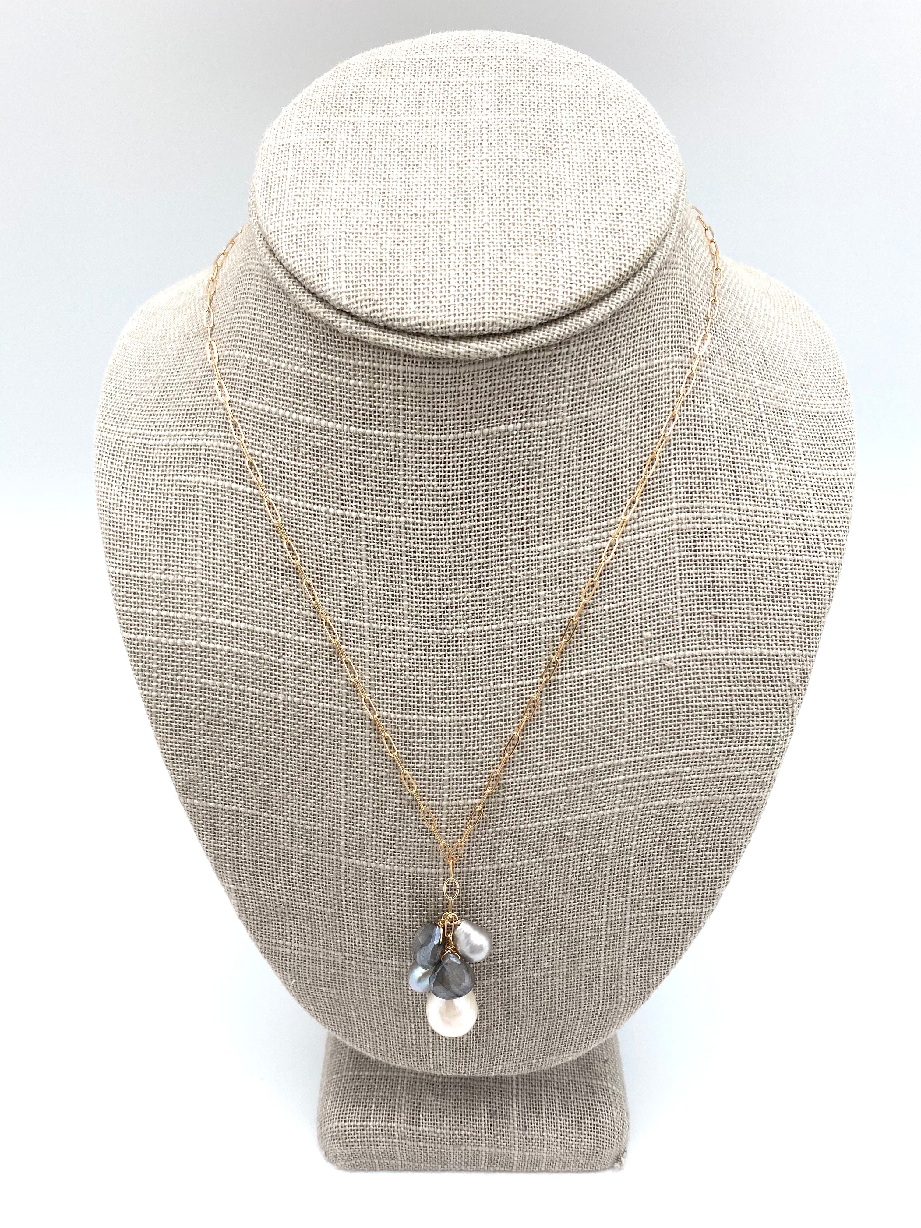 Delicate gold fill paper clip chain necklace. Drop featuring labradorite, freshwater pearls and a small baroque pearl.