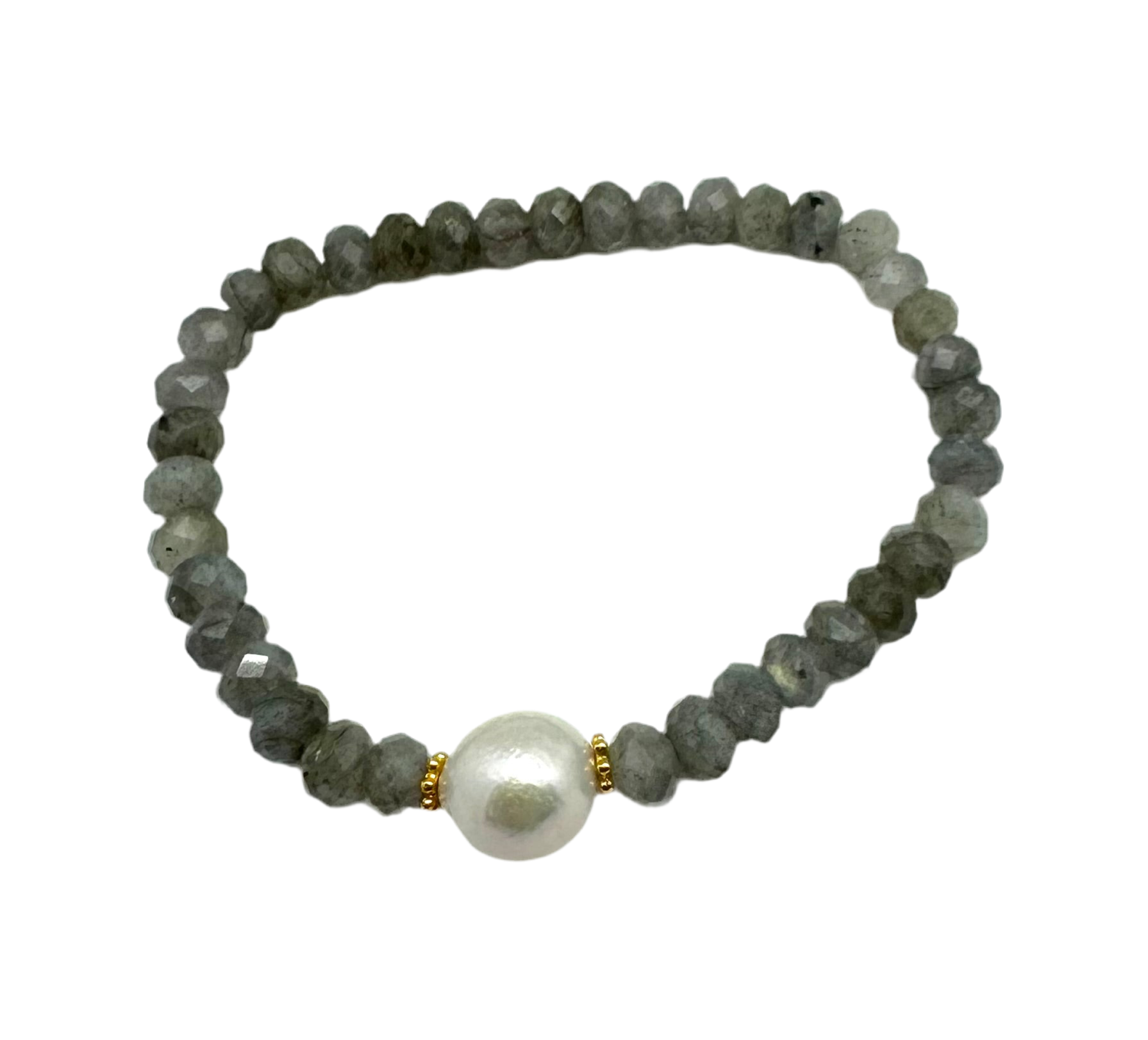 Labradorite stretch bracelet with dainty gold details and one round freshwater pearl. Fabulous piece for layering.